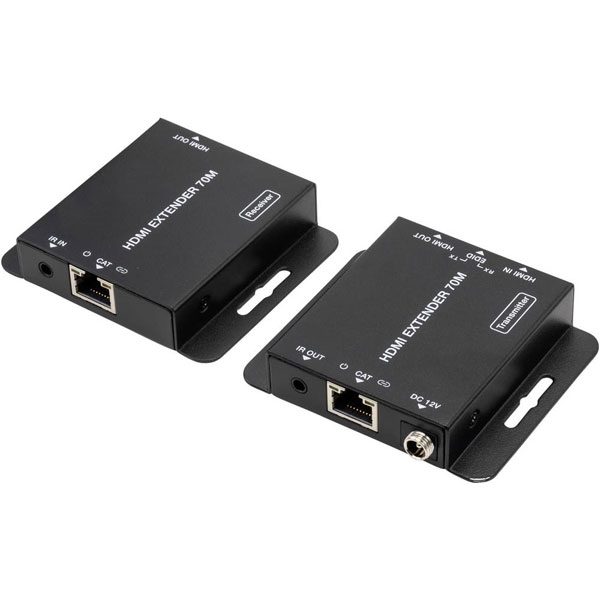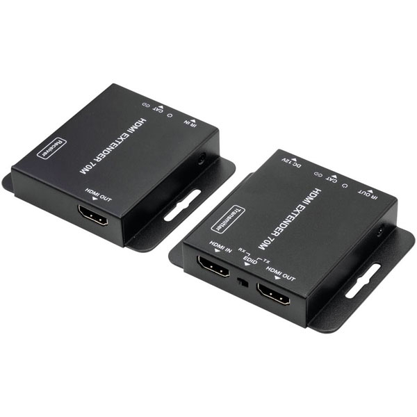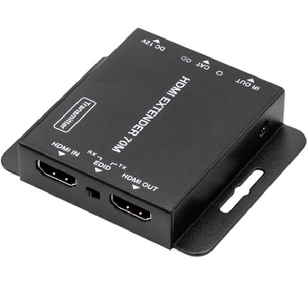 دستگاه افزایش طول 70 متری HDMI با یک کابل شبکه تصاویر را بدون نویز و به صورت FULL HD و با کیفیت بالا 1080P انتقال می دهد. لازم به ذکر است جنس کابل استفاده شده باید از نوع کابل CAT6-CAT5E تمام مس باشد.کارکرد دستگاه به این شکل هست که دستگاه فرستنده در مبدا با ورودی تصویر HDMI و آداپتور برق قرار می گیرد ، به طور مثال مبدا می تواند دستگاه DVR – نوت بوک – کامپیوتر – گیرنده دیجیتال – اندروید باکس باشد که تصویر داخلی رو از پورت HDMI خروجی می دهند و می توان با استفاده از کابل HDMI مرغوب اتصال بین دستگاه فرستنده برقرار کرد، نکته قابل ذکر در دستگاه Transmiter این هست که خروجی HDMI دوم برای نمایش همان تصویر ورودی اول هست به این معنی که خروجی کیس رو با کابل HDMI متصل کردین به دستگاه Transmiter و دیگه تصویر اون کیس رو ندارین شما در اون محل این قابلیت وجود داره در این دستگاه که از خروجی HDMI بعدی دوباره با کابل HDMI اتصال بدین به مانیتور و بتونید استفاده کنید و همزمان تصویر رو روی شبکه انتقال هم بدین.دستگاه گیرنده با خروجی پورت HDMI اتصال بین نمایشگر (تلویزیون – مانیتور – دیتا پروژکتور ) را برقرار می کند. فاصله بین دو دستگاه می تواند از طریق کابل شبکه مرغوب 70 متری پشتیبانی کند .